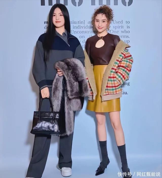 何超莲则身着黑色皮质上衣搭配黄色皮裙,外搭格子外套,造型精致混搭,展现出青春活力的同时又不失时尚感。 因带着长期浸润在名利场的稳重与得体,她的笑容和姿态都拿捏着分寸,展现出成熟贵气的一面。